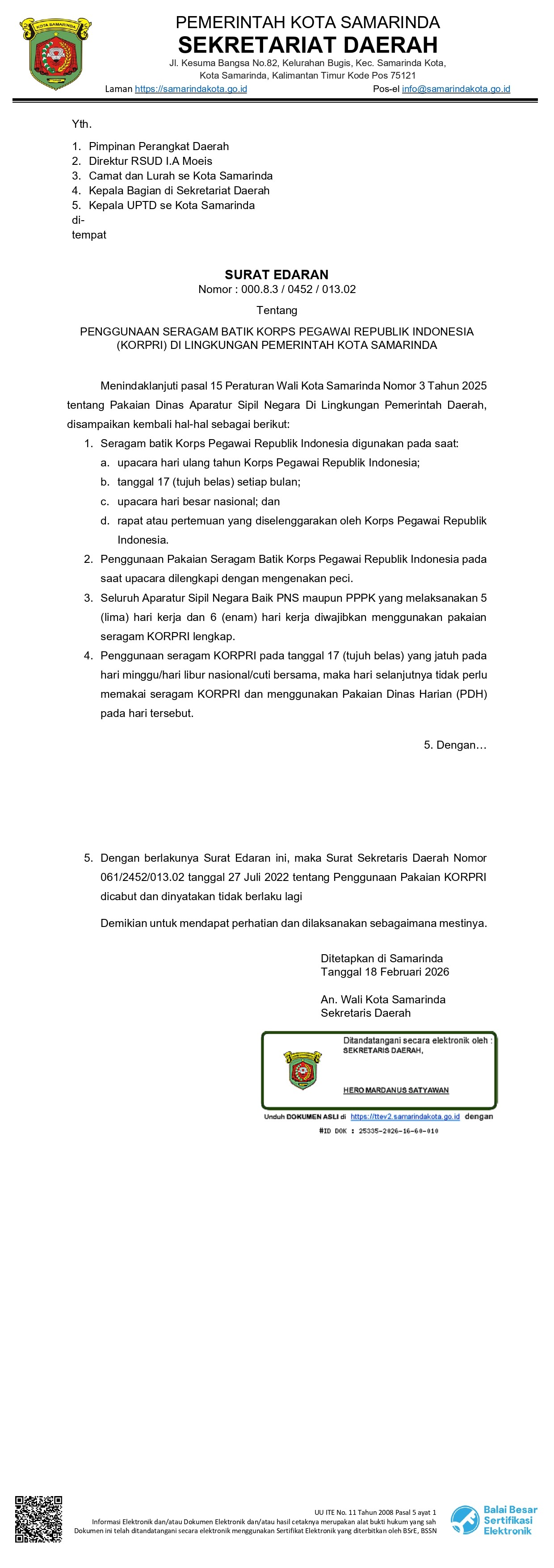 SE Sekretariat Daerah Kota Samarinda tentang Penggunaan Seragam Batik KORPRI