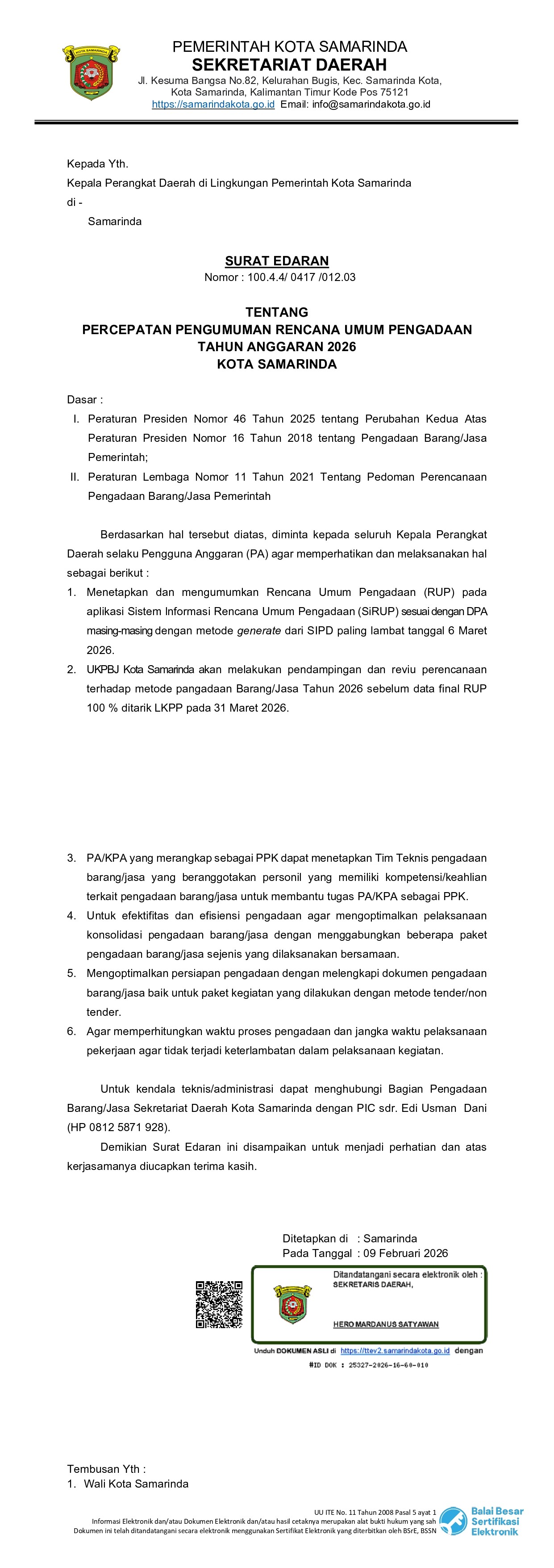 SE Sekretariat Daerah Kota Samarinda tentang Percepatan Pengumuman RUP 2026