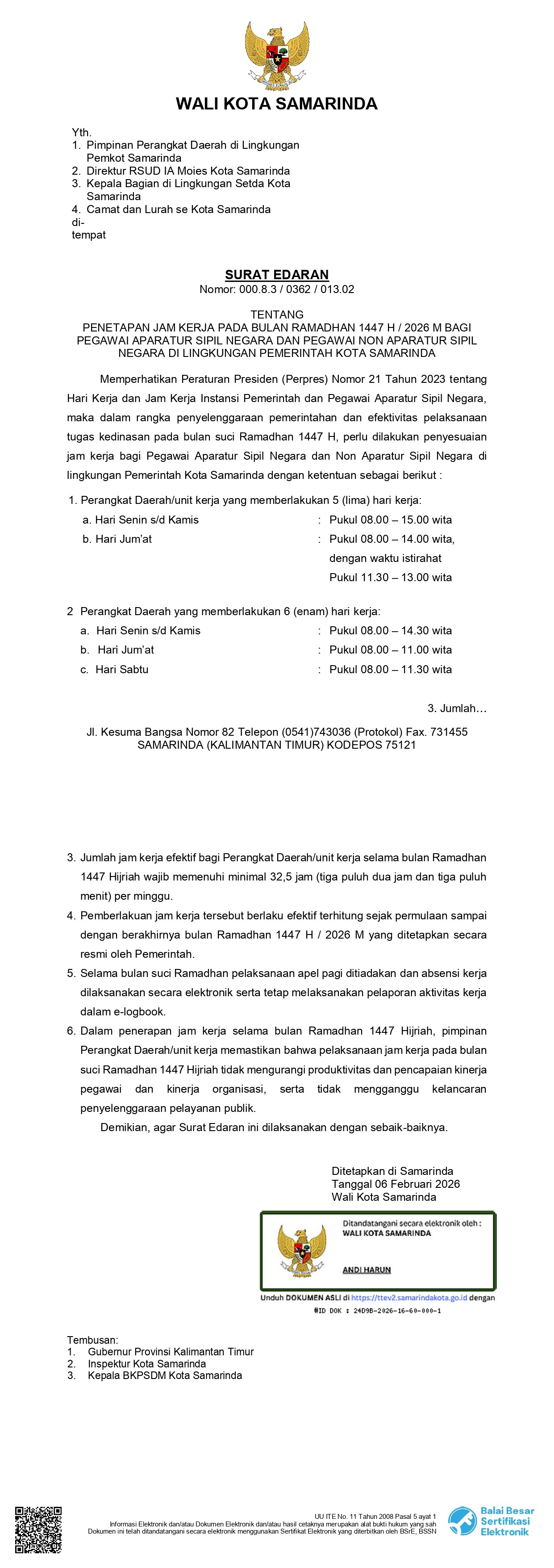 SE Wali Kota Samarinda Penetapan Jam Kerja Pada Bulan Ramadhan 1447 H/ 2026 M